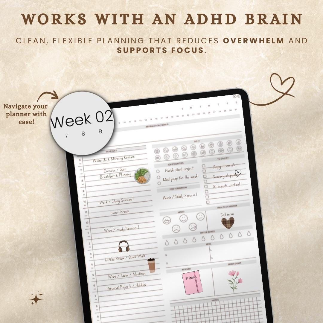 Feeling scattered, overwhelmed, or frustrated by traditional planners? You’re not alone — and it’s not your fault. Most planners aren’t designed for ADHD brains. This 2026 digital planner was thoughtfully crafted to help neurodivergent minds stay organized, focused, and calm — without rigid systems or guilt.