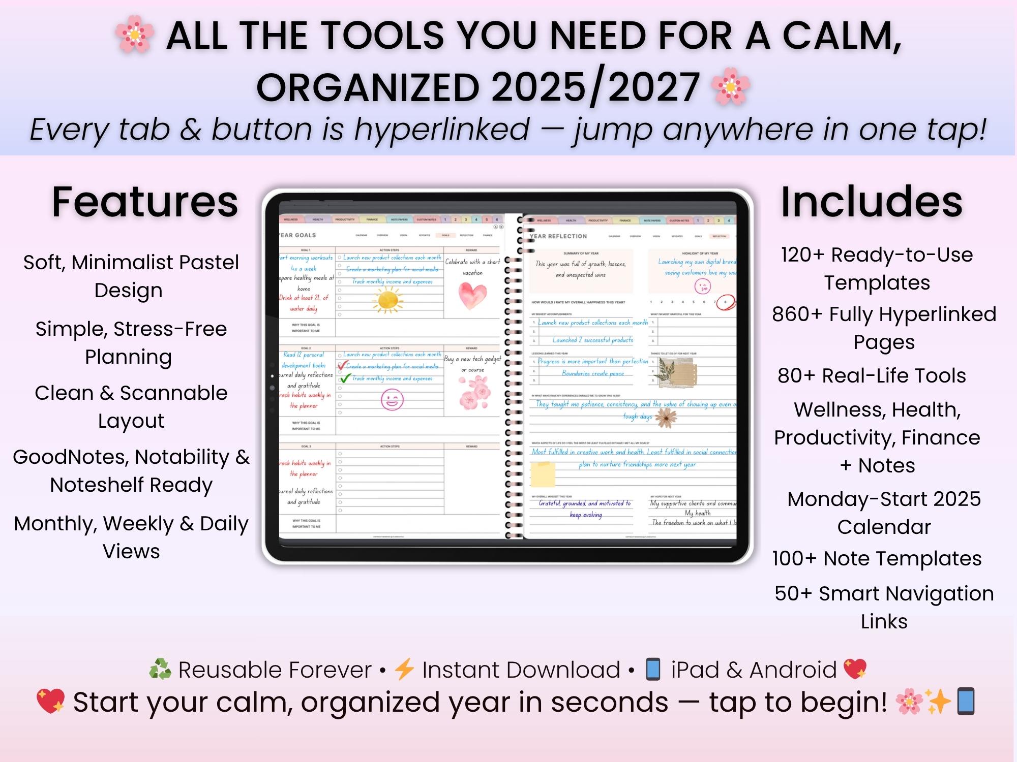 "All-In-One Digital Planner 2025 2026 2027 Undated, Daily Weekly Monthly Goodnotes iPad Planner With Hyperlinks, Calendar, Journal Templates"
