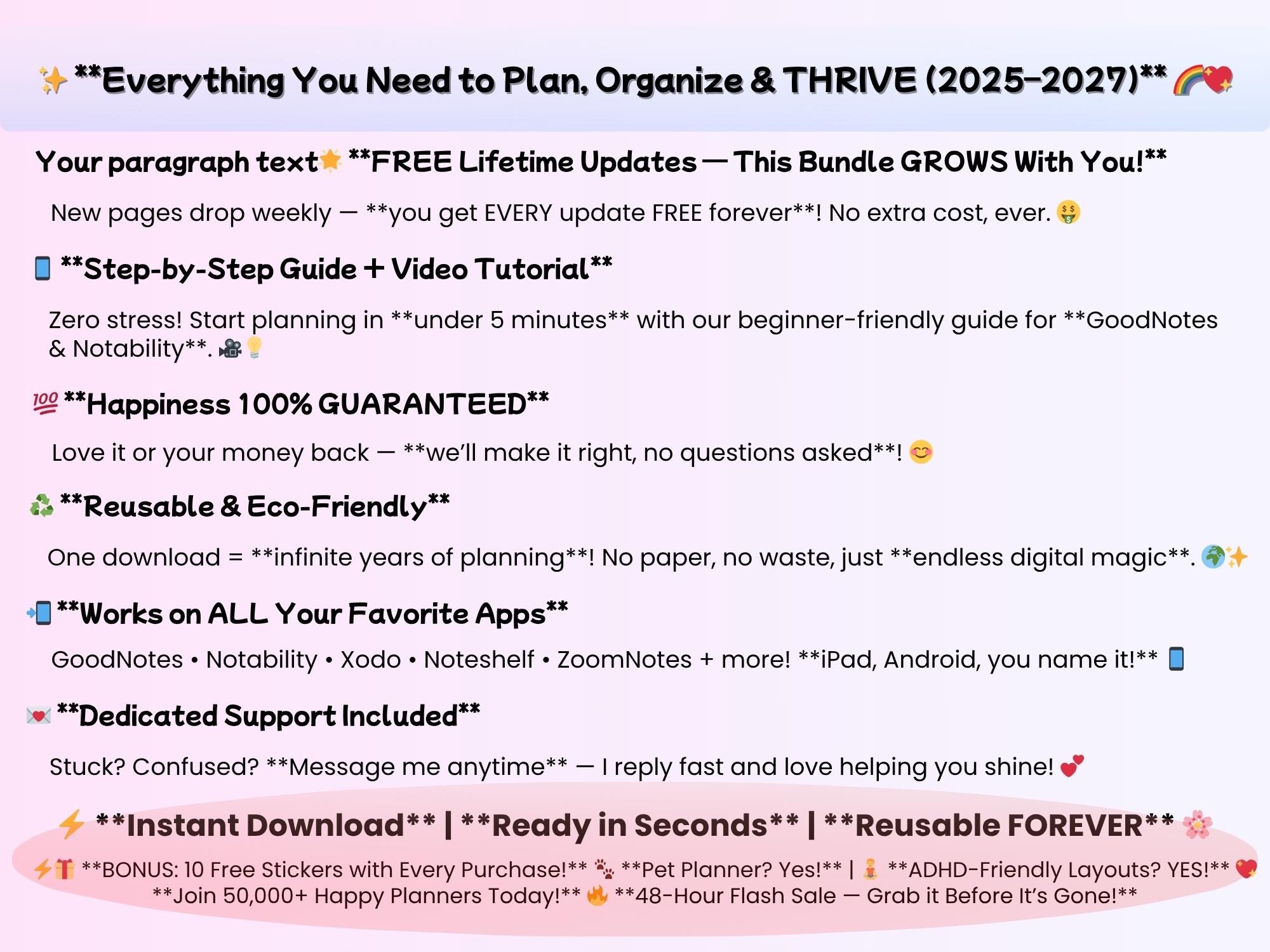 Lifetime access + free yearly updates: Your digital planner evolves with you—no rebuying needed.