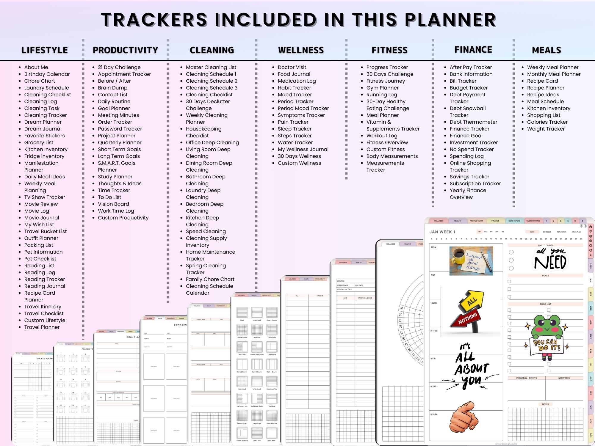 Includes: daily/weekly/monthly, habit tracker, goal planner, budget tracker, meal planner, self-care, project tracker, notes + Apple/Google Calendar Links