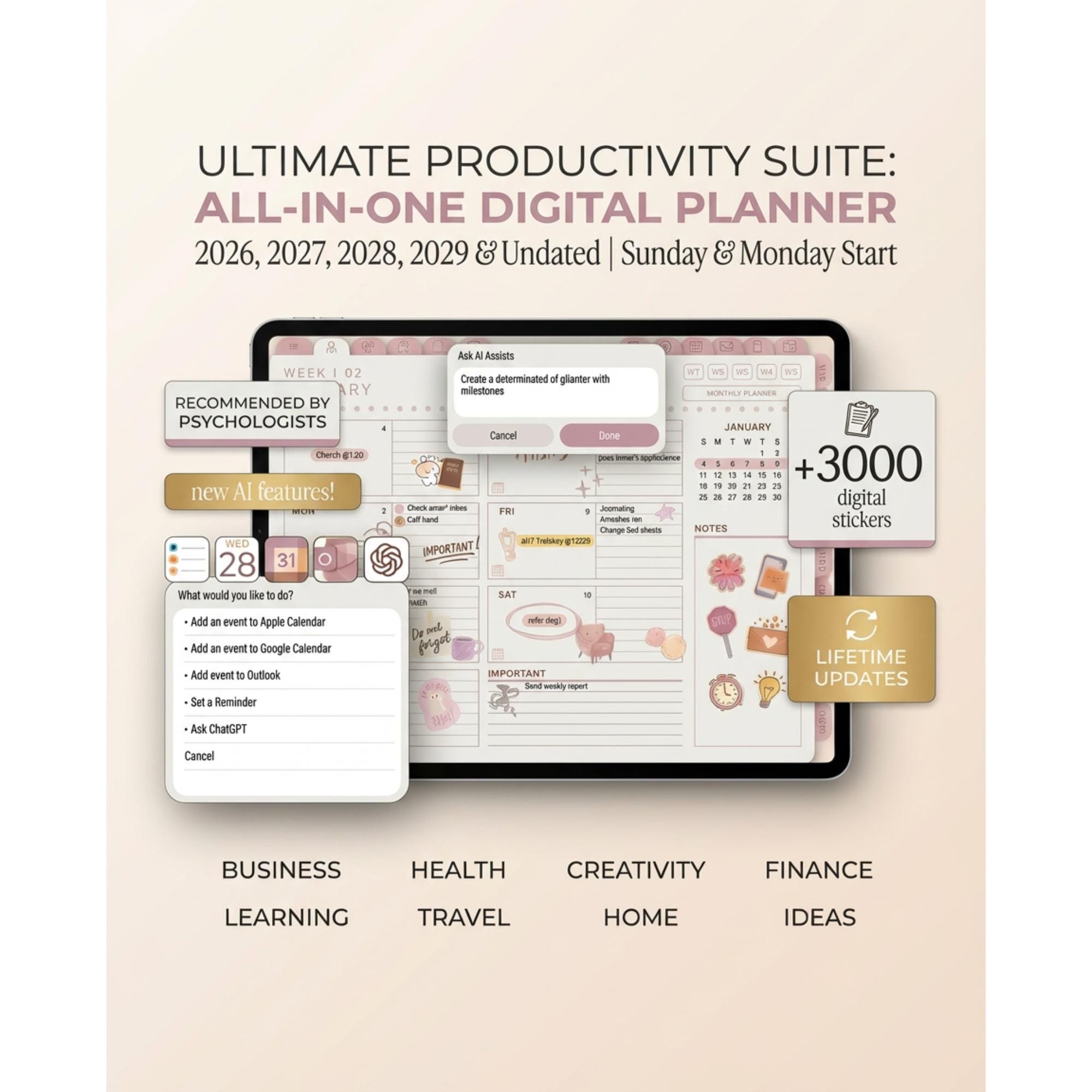 All-in-One Digital Planner for iPad, GoodNotes, and PDF apps. Includes daily, weekly, and monthly layouts, ADHD-friendly structure, habit & goal tracking, finance planning, wellness tools, and more. Ideal for students, busy moms, professionals, and business owners.All-In-One Digital Planner 2026 2027 2028 2029, iPad GoodNotes Planner, Daily Weekly Monthly Hyperlinked ADHD-Friendly Planner