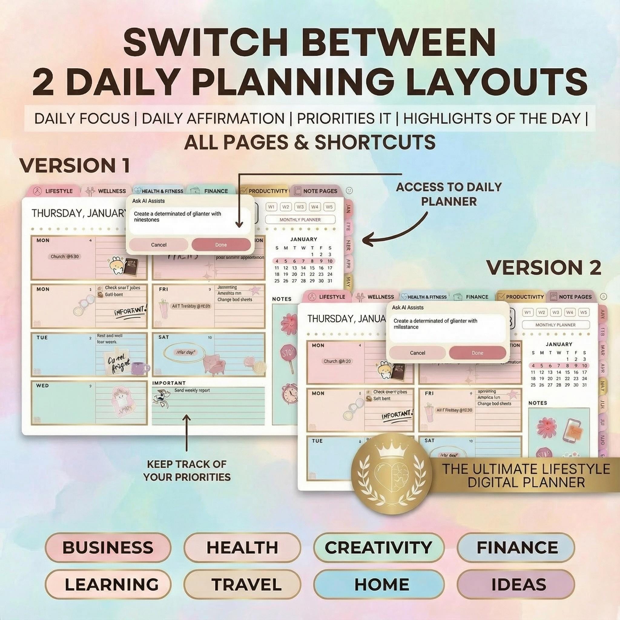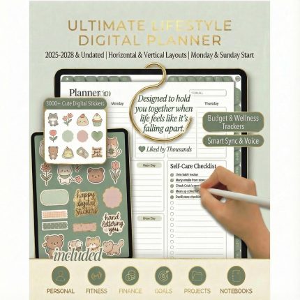 All-in-One Digital Planner for iPad, GoodNotes, and PDF apps. Includes daily, weekly, and monthly layouts, ADHD-friendly structure, habit & goal tracking, finance planning, wellness tools, and more. Ideal for students, busy moms, professionals, and business owners. All-In-One Digital Planner 2026 | Life Organization & Goal Planning | Hyperlinked iPad Planner for GoodNotes