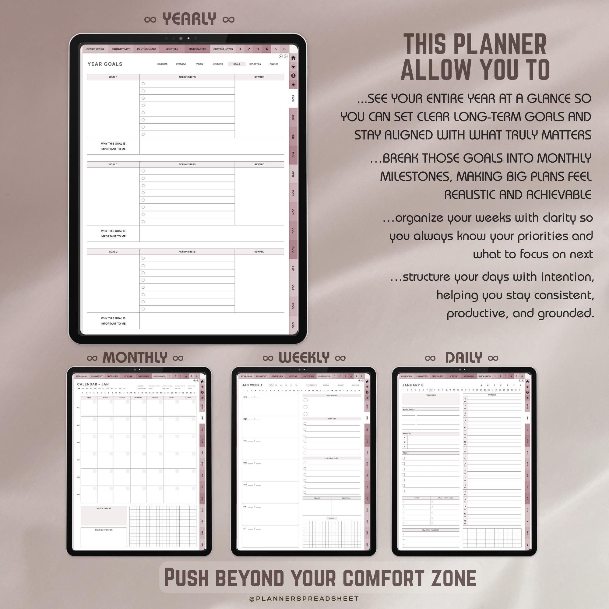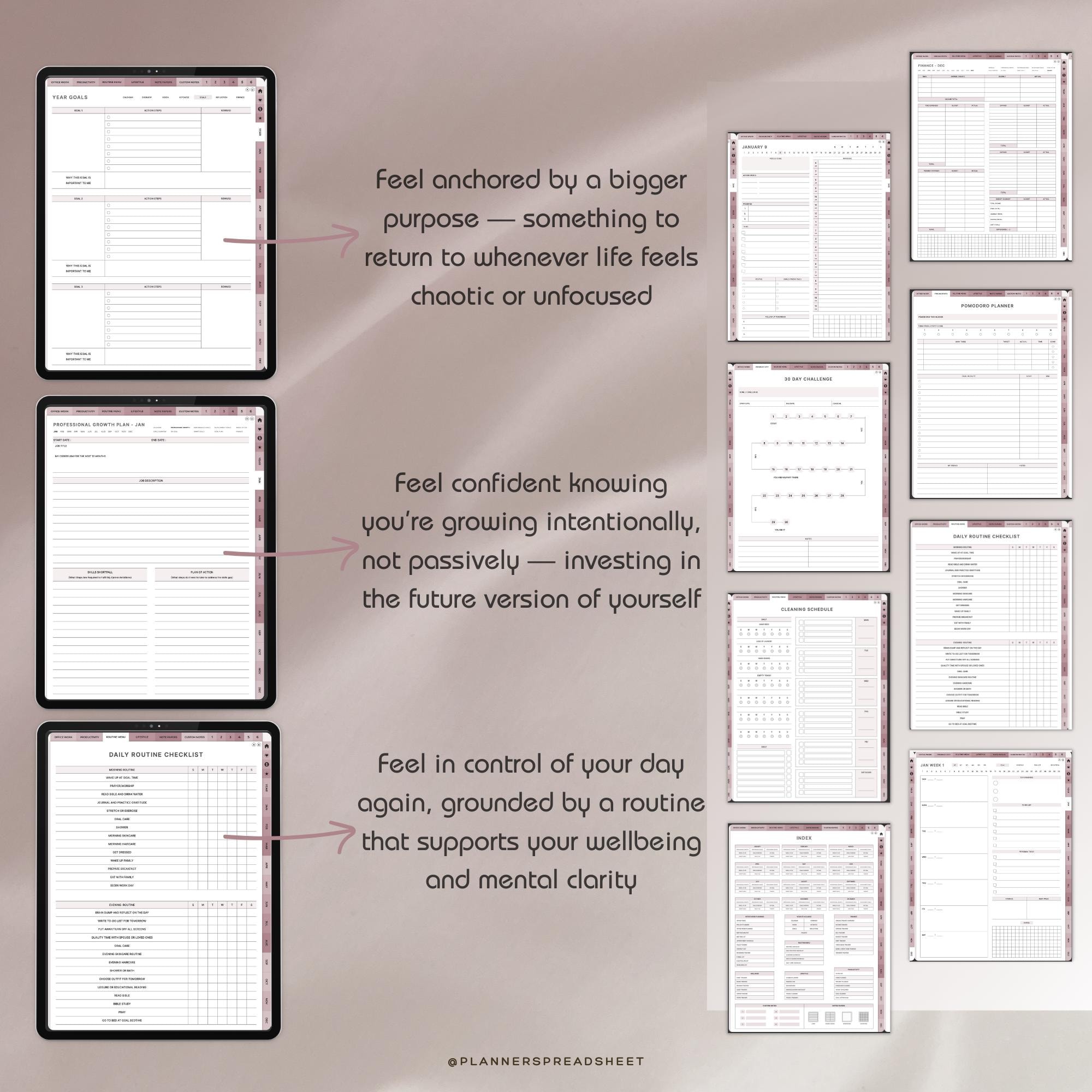 This planner blends clean aesthetic design with powerful personal-growth frameworks — Pomodoro, Wheel of Life, Goal Planning, Mood Tracking, Routines, and Daily Checklists — so you can stay focused, consistent, and grounded throughout your year.