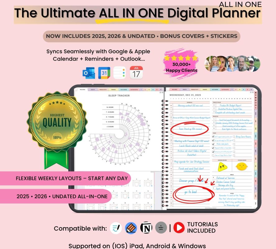 All-In-One Digital Planner 2025 2026 2027 Undated, Daily Weekly Monthly Goodnotes iPad Planner With Hyperlinks, Calendar, Journal Templates